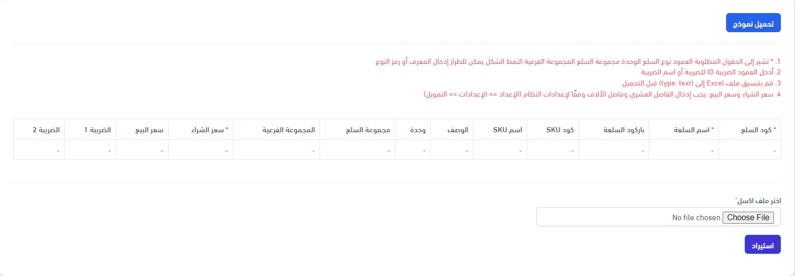 • زر الأصناف المستوردة: يمكنك استخدام زر "الأصناف المستوردة" لاستيراد المنتجات حسب الخطوات التالية: