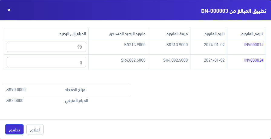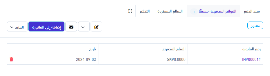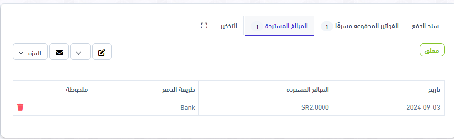 - مفتوح: أي أنه يمكن تطبيق المبلغ المتبقي على فاتورة مشتريات لإغلاق جزء منها أو كامل قيمتها، أو استرجاع المبلغ.