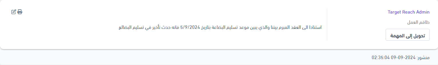 - يمكنك تحويل البطاقة إلى مهمة موجهة إلى الموظف المعني بحل المشكلة، أو طباعتها، أو تعديلها. تجد هذه الخيارات أسفل الشاشة.