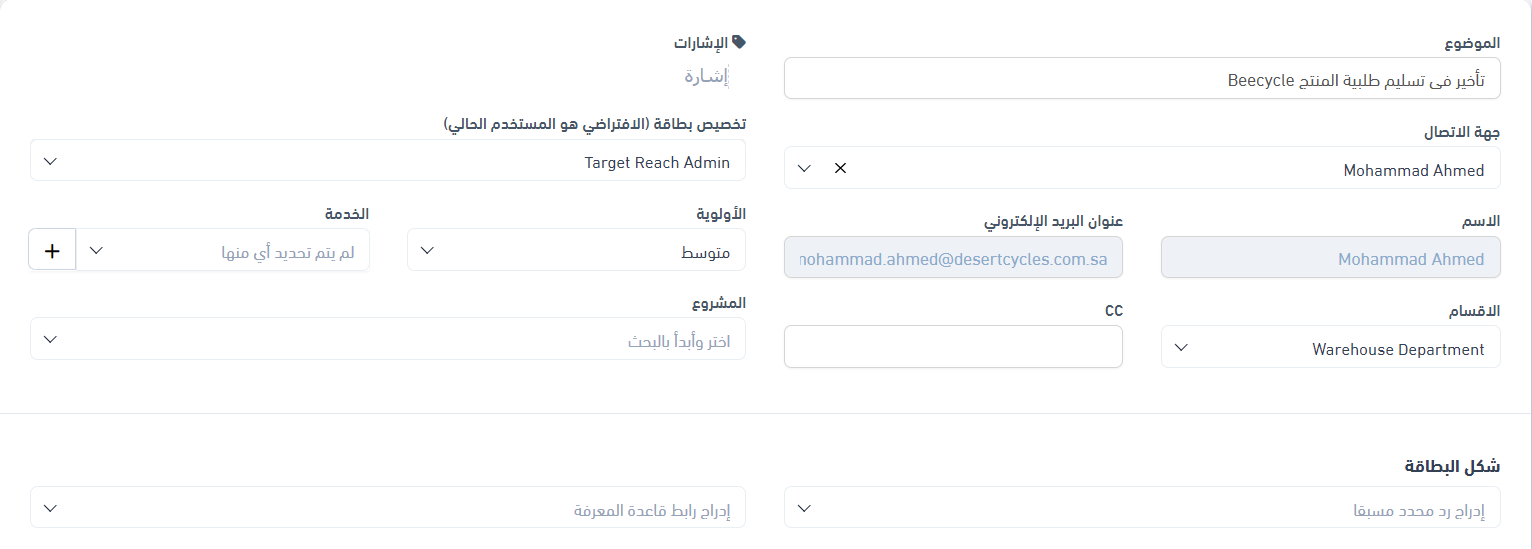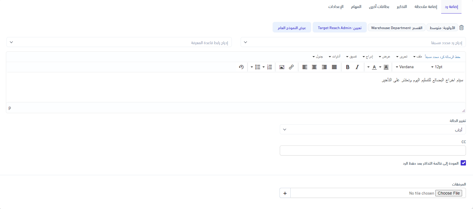 - للرد مباشرة على العميل، اكتب في الصندوق المخصص. يمكنك أيضًا تغيير حالة البطاقة، وإدخال إيميلات إضافية في حقل "cc" إذا أردت إرسال إشعارات إلى عناوين أخرى. في قسم المرفقات، يمكنك إرفاق صورة أو ملف مع الرد.